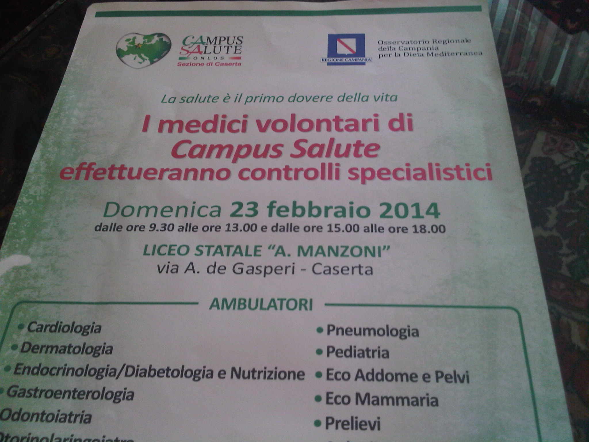 "Quale autorità sanitaria della città chiederò ai dirigenti scolastici della nostra città di favorire al massimo lo sviluppo di questa iniziativa nelle scuole di ogni ordine e grado. Siamo i primi ad affermare sulla Terra dei Fuochi gli screening gratuiti assicurati dall'ottima sinergia promossa dal Campus Salute e dall'Osservatorio della Dieta Mediterranea della Regione Campania con il determinante contributo di tante realtà di qualità del nostro territorio. Questa per noi deve diventare una prassi, per fornire risposte concrete ai cittadini su un tema intorno al quale si sono generati spesso allarmismi interessati. Continueremo su questa strada". lo ha detto il sindaco Pio Del Gaudio intervenendo alla presentazione delle attività previste domenica 23 febbraio presso il liceo Manzoni di Caserta.