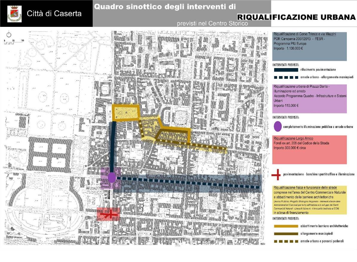 “Questa è la nostra idea di città, una immagine nuova del centro storico con una particolare attenzione all’arredo urbano ed all’abbattimento delle barriere architettoniche. L’obiettivo è rendere la nostra Caserta sempre più ospitale per cittadini e turisti e fruibile anche da chi ha difficoltà motorie. Gli interventi previsti sono numerosi, alcuni dei quali realizzabili soltanto grazie all’ostinazione mia, dell’assessore Palmiero e dei dirigenti comunali che ha permesso di sbloccare e recuperare in Regione progetti e, soprattutto, finanziamenti ormai persi”. Lo ha detto il sindaco di Caserta Pio Del Gaudio presentando in Sala Consiliare con l’assessore ai Lavori Pubblici Massimiliano Palmiero gli interventi di riqualificazione urbana previsti nel centro storico.