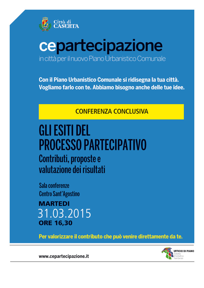 Martedì 31 marzo nella Sala Conferenza del Centro Sant’Agostino in via Mazzini a Caserta,alle ore 16, 30 avrà luogo la Conferenza conclusiva del percorso di partecipazione al preliminare di Piano Urbanistico Comunale (PUC).