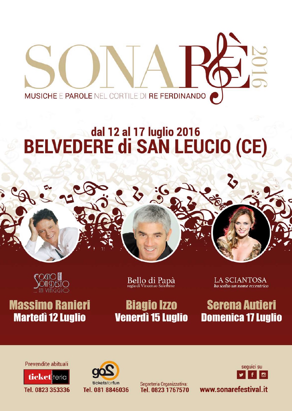 “Sonarè è una manifestazione molto importante, in quanto mette in pratica alcuni elementi fondamentali per lo sviluppo delle politiche del turismo e della cultura”. Lo ha dichiarato il sindaco di Caserta Carlo Marino intervenendo alla conferenza stampa di presentazione di SONARE’ FESTIVAL 2016, la rassegna di musica e teatro che vedrà protagonisti, dal 12 al 17 luglio prossimi, artisti di grande calibro nel cortile principale dello storico e suggestivo Belvedere di San Leucio.