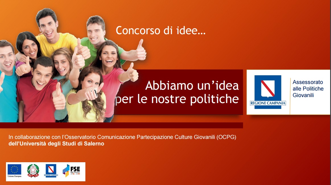 L’Assessorato alle Politiche Giovanili della Regione Campania, con la collaborazione dell’Osservatorio Comunicazione Partecipazione Culture Giovanili (OCPG) dell’Università degli Studi di Salerno, indice il concorso di idee “Crea un logo e un payoff per l’Osservatorio regionale delle Politiche Giovanili”.