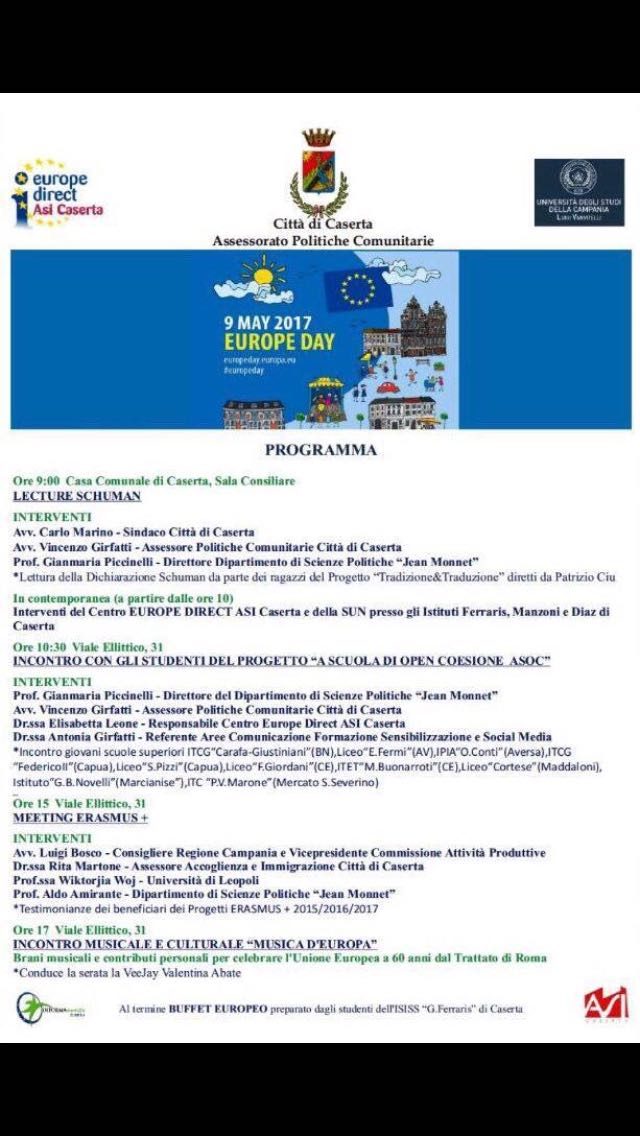 Contemporaneamente, presso gli istituti superiori Ferraris, Manzoni e Diaz si svolgeranno incontri sul tema a cura del Centro Europe Direct Asi Caserta. Alle 10,30 in via Ellittico 31, al via l'incontro con gli studenti del progetto “A scuola di Open Coesione Asoc”. Nella stessa sede, alle 15,00 comincerà il Meeting Erasmus ed alle 17,00 conclusione affidata all'incontro musicale e culturale “Musica d'Europa”, con brani musicali e contributi personali per celebrare l'Unione Europea a 60 anni dal Trattato di Roma.