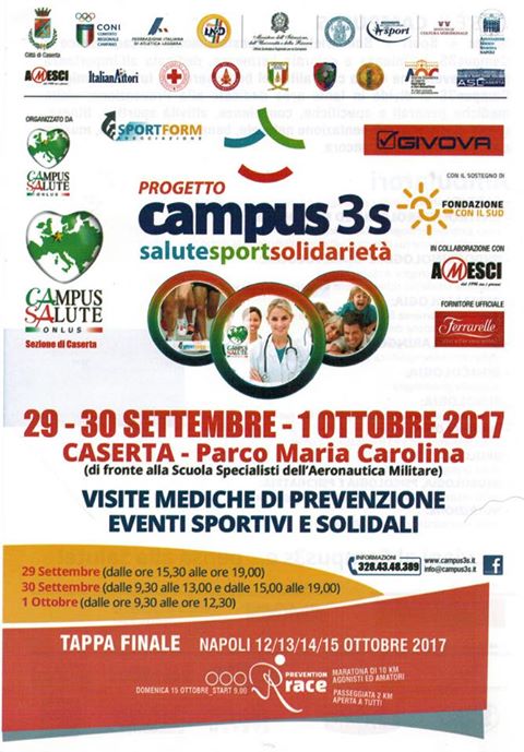 Mercoledì prossimo 27 settembre alle ore 12.00 presso la Sala Giunta del Comune di Caserta, si terrà la conferenza stampa della manifestazione Campus3S promosssa da Campus Salute Onlus e dall’Associazione Sportform. La manifestazione, che ha anche il patrocinio del Comune di Caserta, si svolgerà nella meravigliosa cornice del Parco Maria Carolina, al viale Douhet nei pressi della Reggia di Caserta, il 29, 30 settembre e il 1 ottobre prossimi, trasformando l’attraente scenario in una grande area che celebrerà il sostegno alla Salute ed al Benessere. In programma visite mediche di prevenzione e una vasta gamma di eventi sportivi e divertenti per tutta la famiglia.