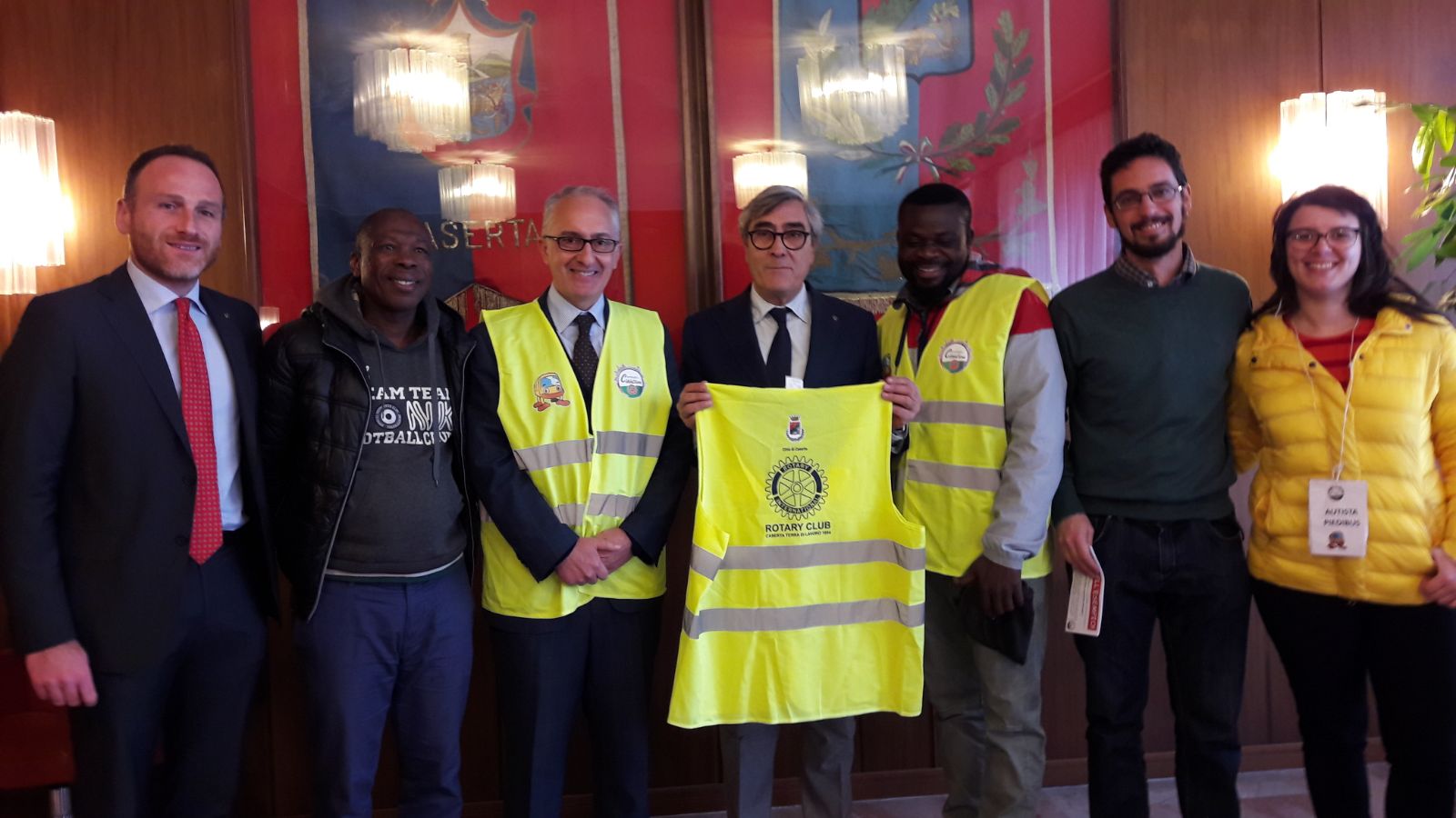 Il Rotary Club Caserta Terra Di Lavoro ha donato questa mattina 100 pettorine per il progetto Piedibus, promosso da Comune di Caserta e Comitato Città Viva, con la collaborazione del Csa Ex Canapificio Caserta ed i migranti del Progetto Sprar. Alla breve cerimonia hanno partecipato, con il Sindaco Carlo Marino, tra gli altri, il presidente del Rotary Club Fabrizio Fusco, il segretario incoming dell’associazione Vincenzo Iorio, Vincenzo Fiano del Comitato Città Viva e Mamadou Sy dell’Associazione Senegalesi.