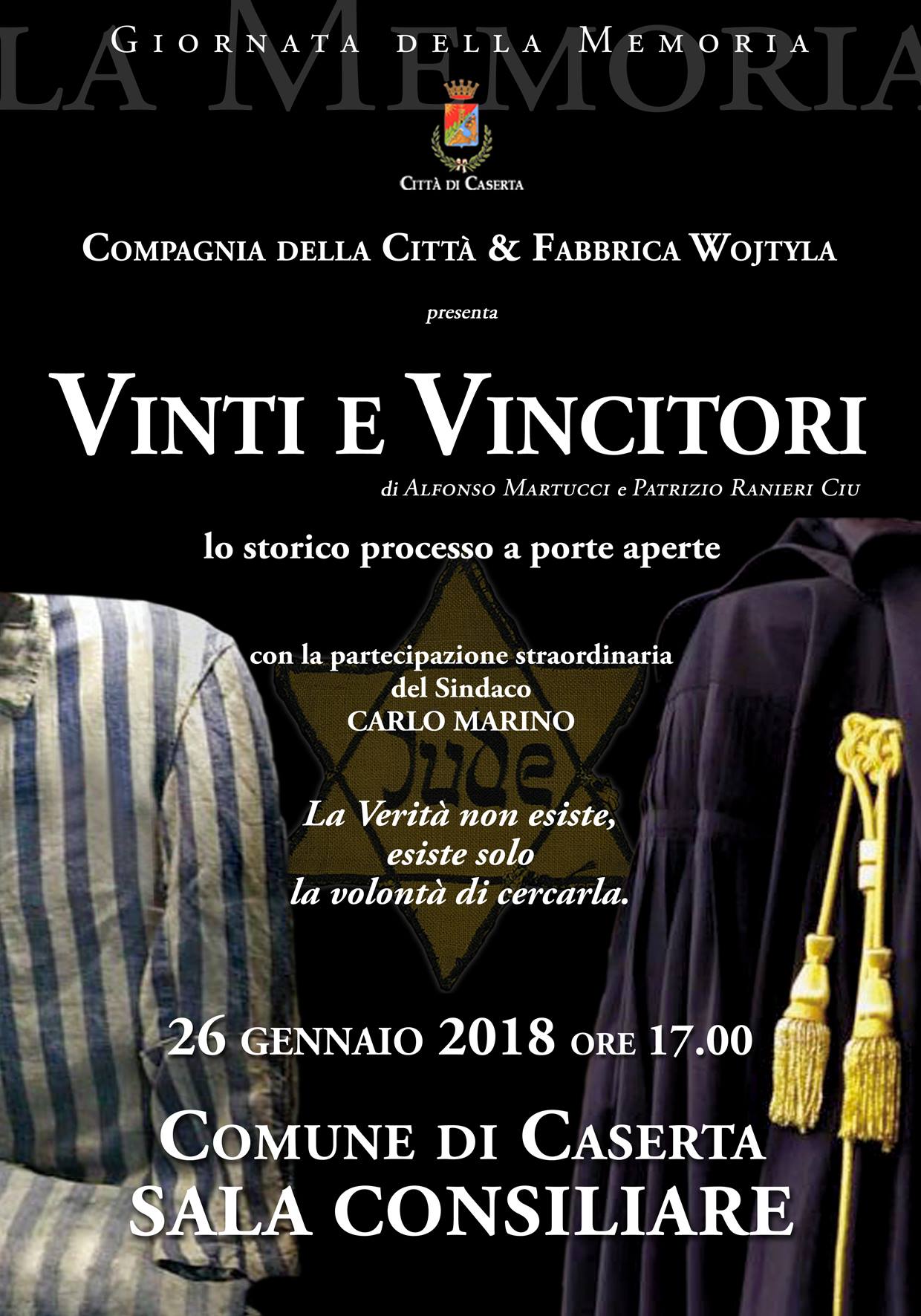 GIORNATA DELLA MEMORIA 2018 - SPETTACOLO "VINTI E VINCITORI" - COMUNE DI CASERTA, SALA CONSILIARE OGGI ORE 17