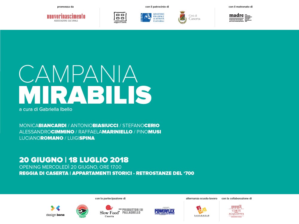 Mercoledì 20 giugno alle 17.00, presso le retrostanze del ‘700 degli appartamenti storici della Reggia di Caserta, sarà inaugurata la mostra fotografica Campania Mirabilis, a cura di Gabriella Ibello con foto di Monica Biancardi, Antonio Biasiucci, Stefano Cerio, Alessandro Cimmino, Raffaela Mariniello, Pino Musi, Luciano Romano e Luigi Spina. La mostra, promossa dall’associazione culturale Nuovorinascimento con il Patrocinio del MIBACT, Reggia di Caserta, Comune di Caserta e con il Matronato della Fondazione Donnaregina per le arti contemporanee, sarà visitabile fino al 18 Luglio 2018.