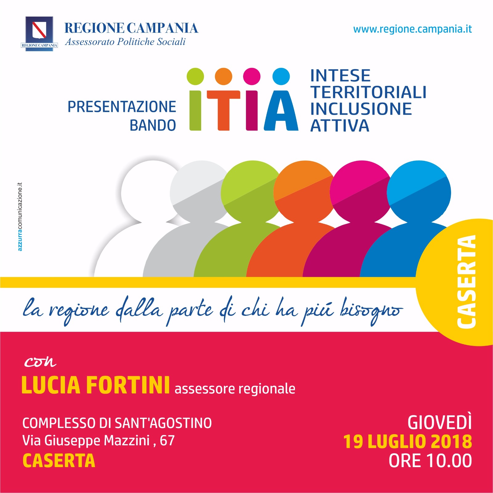 Domani, giovedì 19 luglio alle ore 10, presso il Complesso di Sant'Agostino di via Mazzini, verrà presentato il bando Itia (Intese territoriali inclusione attiva), intervento di fondamentale importanza nel campo delle politiche sociali e dell'assistenza verso i più deboli. Alla manifestazione parteciperanno l'assessore regionale alle Politiche Sociali, Lucia Fortini, il sindaco di Caserta, Carlo Marino, e l'assessore alle Politiche Sociali del Comune di Caserta, Mariagiovanna Sparago. Gli interventi contenuti nel bando riguardano azioni complementari al SIA: sostegno dei servizi socio-assistenziali e di inclusione socio-lavorativa delle persone svantaggiate e a rischio di povertà. Esso si inserisce, dunque, nel quadro della strategia nazionale di contrasto alla povertà, avviata con il Piano nazionale per la lotta alla povertà e all’esclusione sociale, la misura di Sostegno all’Inclusione Attiva, le azioni del PON FSE “Inclusione 2014-2020” e il Reddito di Inclusione.