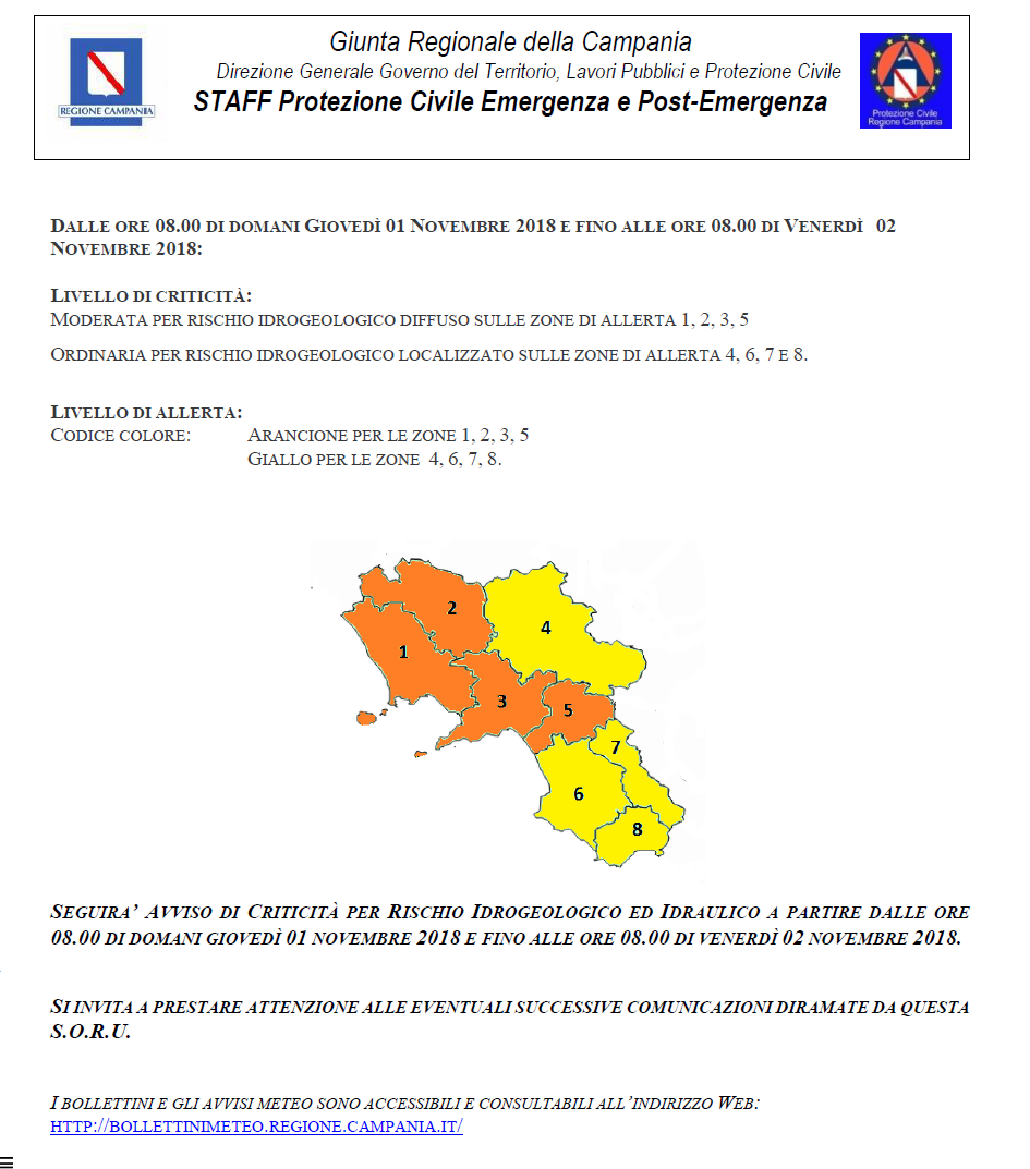 ALLERTA METEO (ARANCIONE) DALLE 8,00 DI GIOVEDI' 1° NOVEMBRE PER 24 ORE