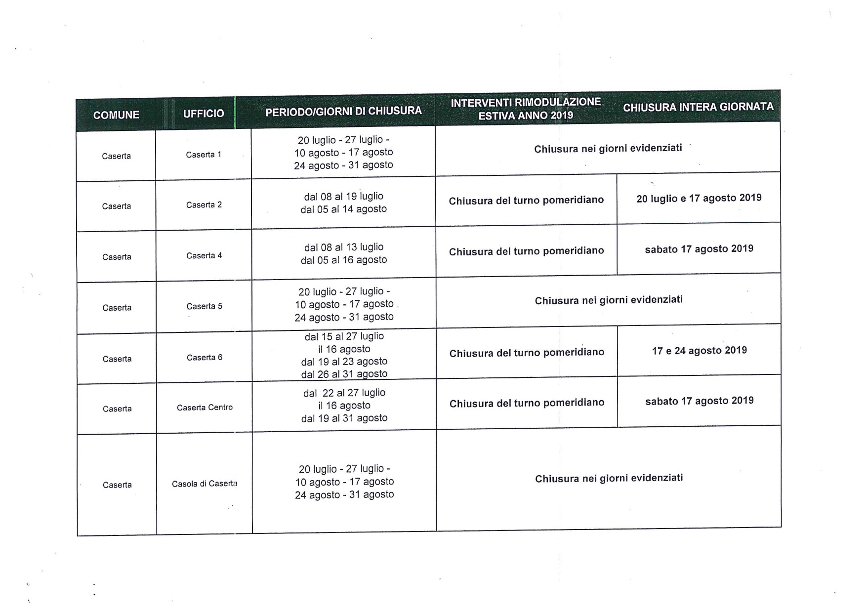 La Direzione della Filiale PT di caserta ha reso note al Comune le aperture estive degli Uffici Postali, valide nei mesdi di luglio ed agosto.