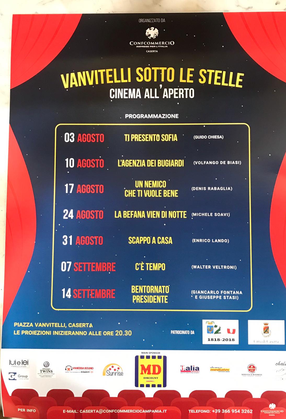 “Vanvitelli sotto le stelle”: presentata in Comune la rassegna di cinema gratuito all’aperto di Confcommercio Caserta che, dal 3 agosto al 14 settembre, a partire dalle ore 20.30, per sette sabati proporrà alla cittadinanza e ai turisti la proiezione di un film in piazza Vanvitelli, con il patrocinio del Comune e della Provincia.