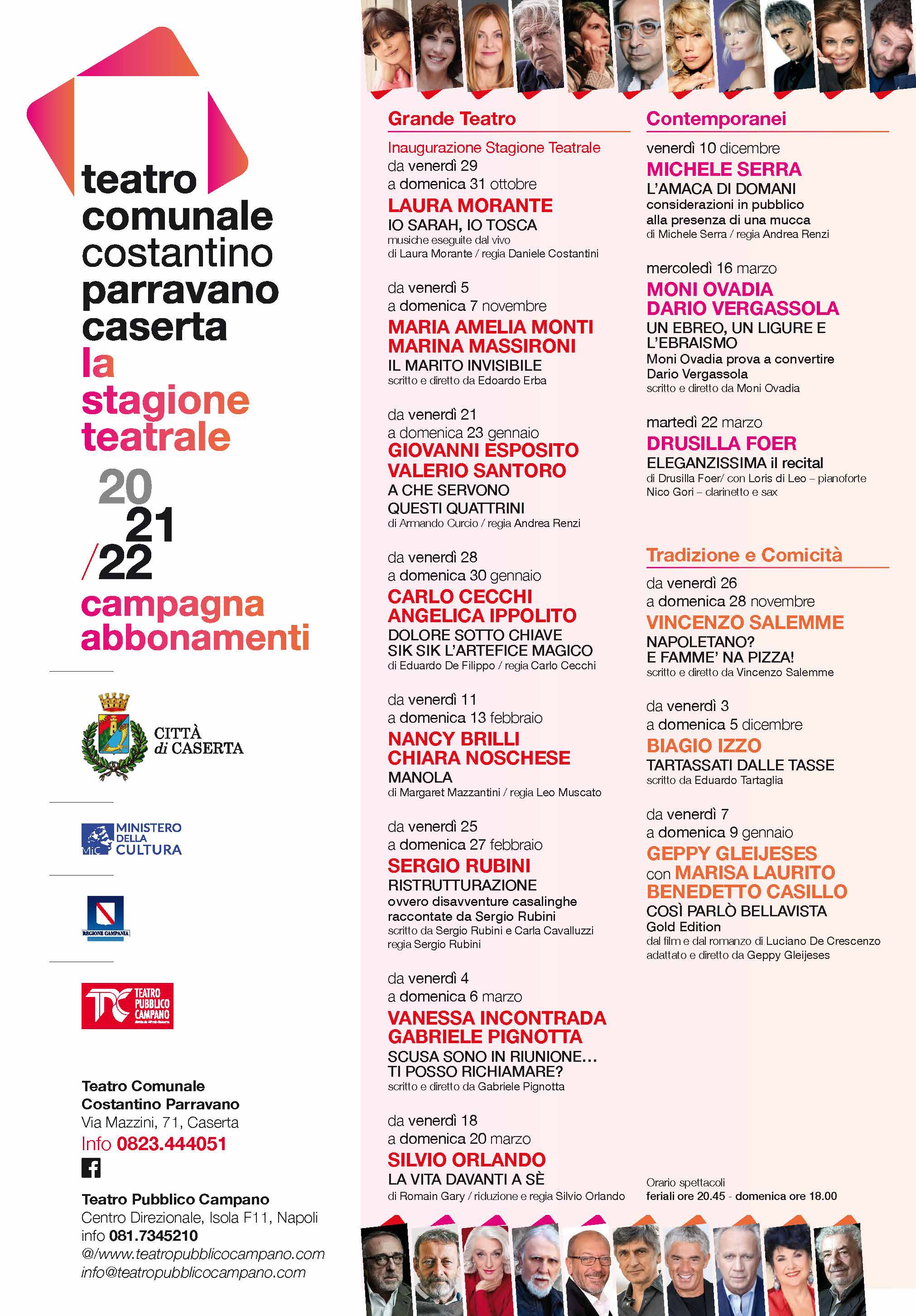 La sezione Grande Teatro sarà composta da otto appuntamenti dal venerdì alla domenica: dopo l’apertura di Laura Morante il cartellone proseguirà dal 5 al 7 novembre con Maria Amelia Monti e Marina Massironi protagoniste de “Il Marito Invisibile”; dal 21 al 23 gennaio Giovanni Esposito e Valerio Santoro con “A che servono questi quattrini”; Carlo Cecchi e Angelica Ippolito saranno sul palco del Comunale dal 28 al 30 gennaio con “Dolore sottochiave” e “Sik Sik L’artefice Magico”; Nancy Brilli e Chiara Noschese vanno in scena con “Manola” dall’11 al 13 febbraio seguite poi dal 25 al 27 febbraio da Sergio Rubini protagonista di “Ristrutturazione”; marzo chiude la sezione Grande Teatro con due appuntamenti dal 4 al 6 con Vanessa Incontrada e Gabriele Pignotta in “Scusa sono in riunione…ti posso richiamare?” e dal 18 al 20 con Silvio Orlando protagonista di “La vita davanti a sé”.
