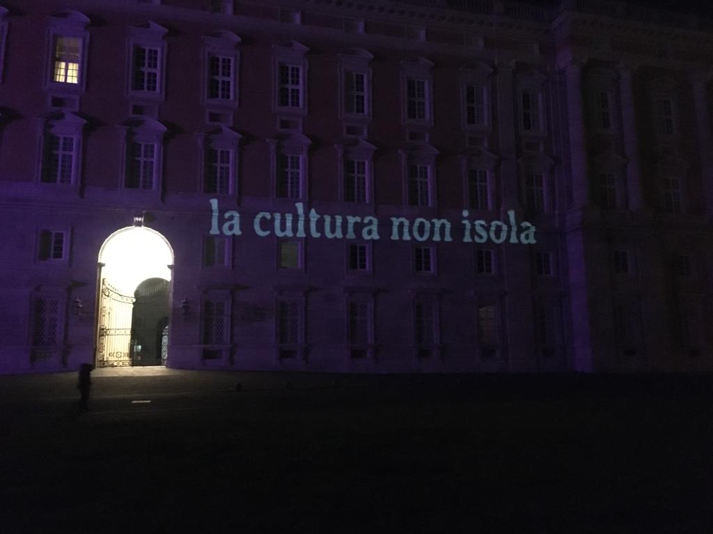 Questa sera la facciata della Reggia di Caserta č stata illuminata con il claim “La cultura non isola”, ideato per promuovere gli eventi e le attivitā di Procida Capitale della Cultura.