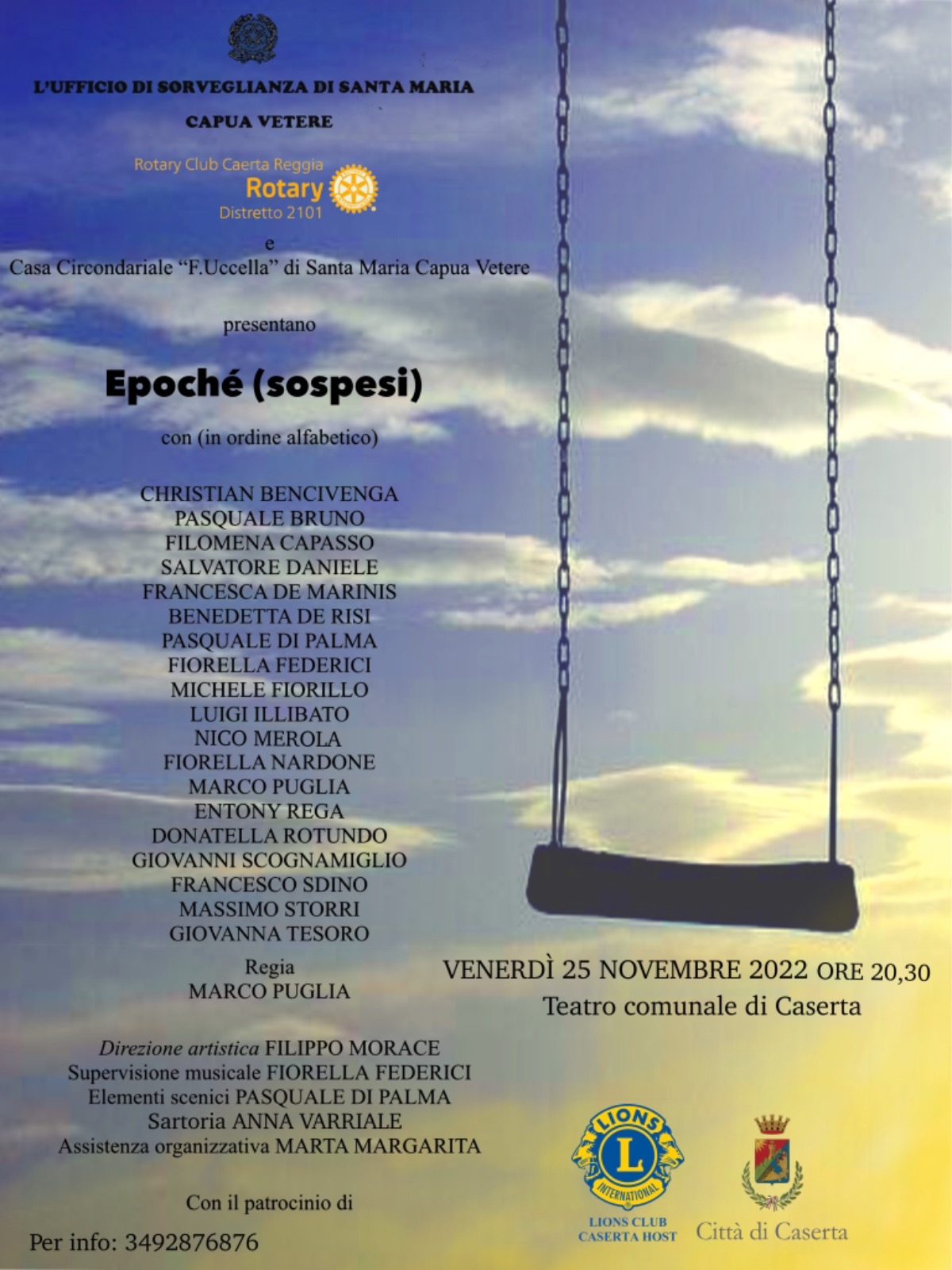 “Epochè” è un evento organizzato dall’Ufficio di Sorveglianza di Santa Maria Capua Vetere, dal Rotary Club Caserta Reggia e dalla Casa Circondariale Uccella di Santa Maria Capua Vetere, con il patrocinio del Comune di Caserta e del Lions Club Caserta Host.