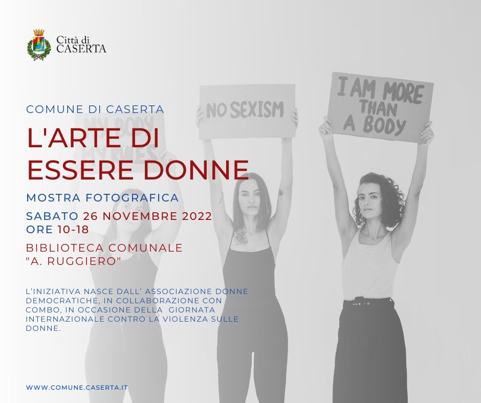Ha il patrocinio del Comune di Caserta l'evento culturale “L’arte di essere donne”. L’appuntamento č per sabato 26 novembre dalle 10 alle 18 presso la biblioteca comunale Alfonso Ruggiero di Caserta. L’iniziativa nasce dall’Associazione Donne Democratiche, in collaborazione con Combo, in occasione della Giornata internazionale contro la violenza sulle donne, che ricorre il 25 novembre di ogni anno.