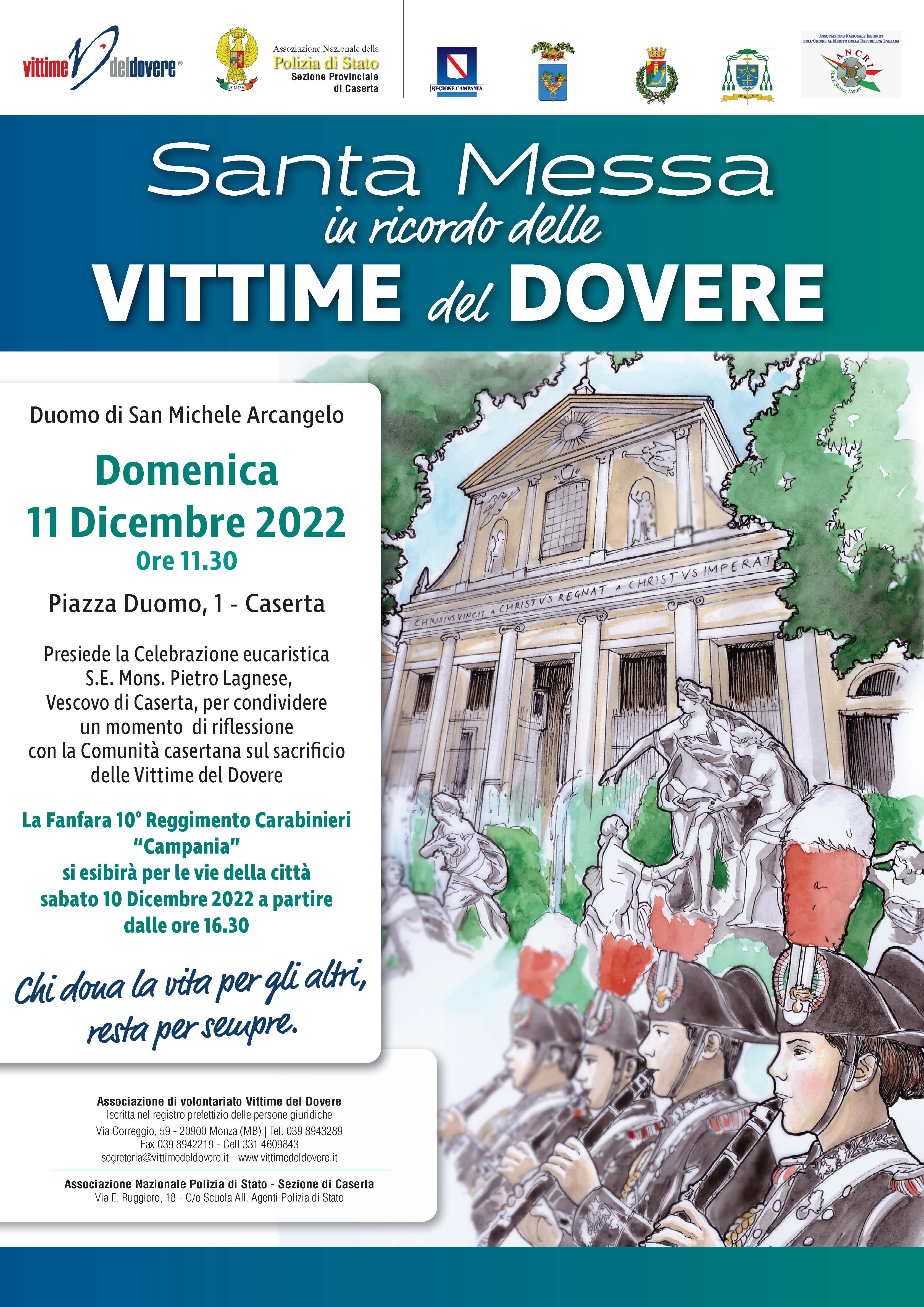 Sabato 10 dicembre, la Fanfara 10° Reggimento Carabinieri “Campania” si esibirà, a partire dalle ore 16.30, per le vie del centro storico della città di Caserta per ricordare l’appuntamento di domenica 11 dicembre, alle ore 11.30, presso il Duomo di Caserta “San Michele Arcangelo”, quando sarà celebrata l’ormai tradizionale Santa Messa per le Vittime del Dovere. Ad officiare la funzione religiosa sarà S.E. Mons. Pietro Lagnese, Vescovo di Caserta. L’iniziativa fu proposta undici anni dal compianto Vescovo Mons. Pietro Farina che ritenne importante ricordare alla comunità casertana il sacrificio delle Vittime del Dovere, ogni terza domenica di Avvento. Da allora la celebrazione eucaristica è diventata un momento ricorrente, molto partecipato soprattutto dalle famiglie delle Vittime del Dovere che si raccolgono insieme in preghiera. Sono, infatti, ricordati uomini e donne delle Forze dell’Ordine, Forze Armate e Magistratura, caduti durante l’adempimento dei propri compiti istituzionali, nel contrasto alla criminalità comune, alla criminalità organizzata e al terrorismo.