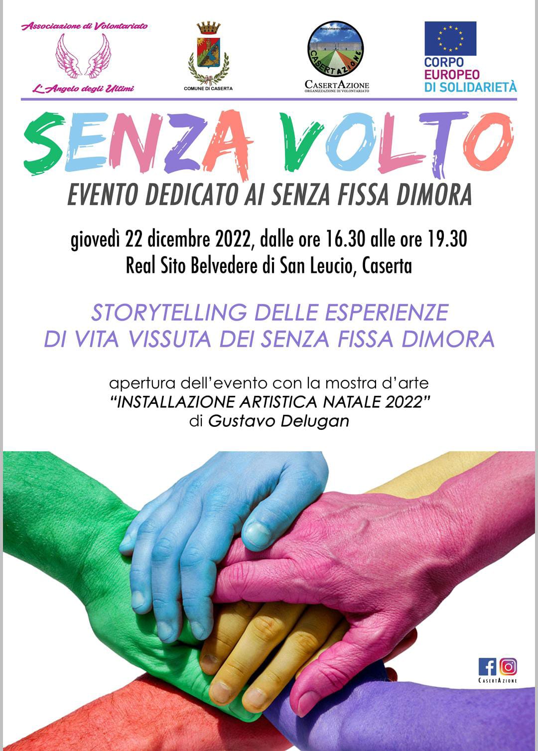 L’evento è promosso dall’associazione CasertAzione con la collaborazione dell’associazione L’Angelo degli Ultimi, patrocinato dal Comune di Caserta. L’apertura sarà affidata alla installazione artistica per il Natale 2022 di Gustavo Delugan. Interverranno l’assessore alla cultura Enzo Battarra, il neo assessore alle politiche sociali Antonio De Lucia, il presidente della quarta commissione consiliare Francesco Guida e la presidente dell’associazione L’Angelo degli Ultimi Antonietta D’Albenzio.
