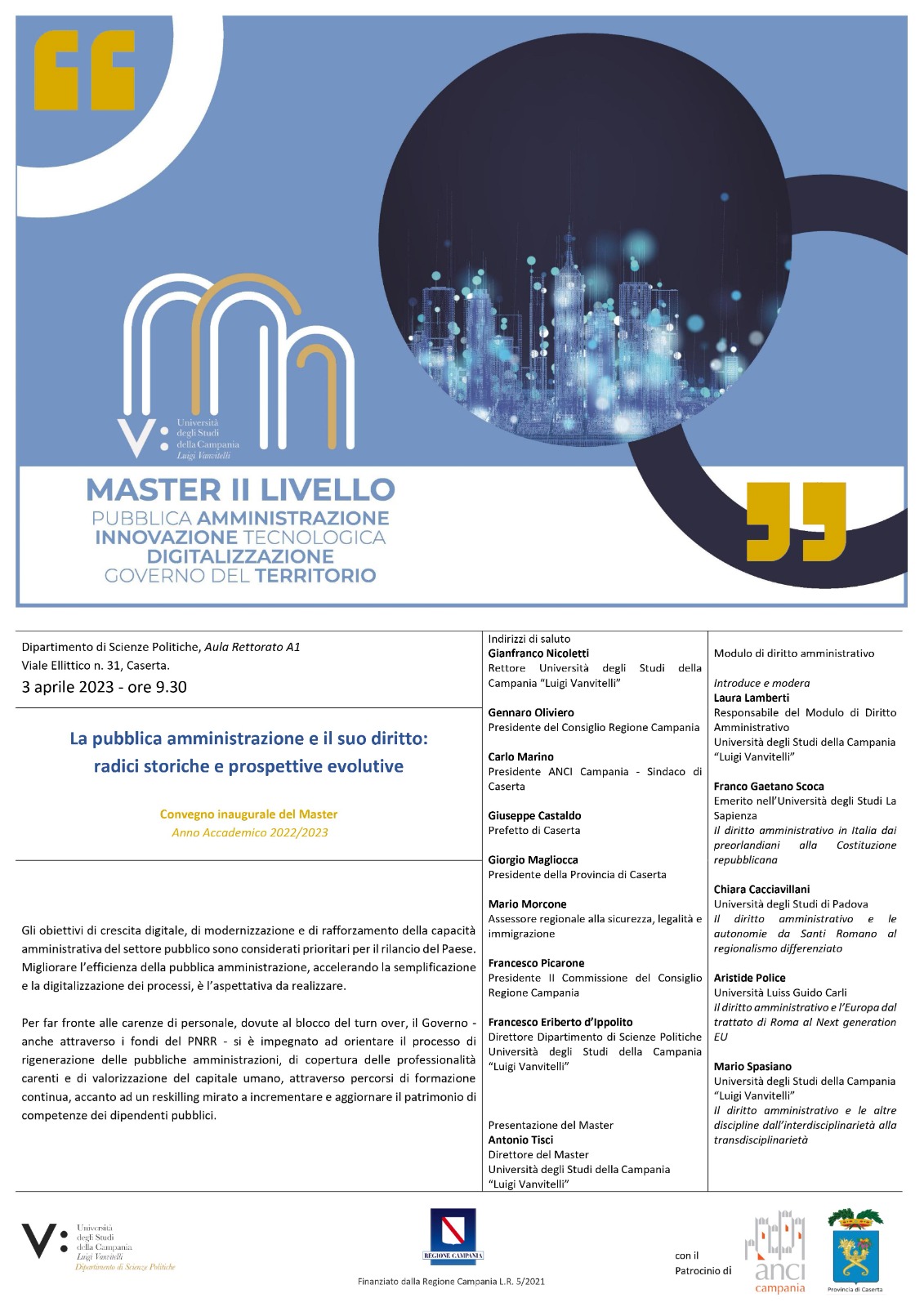 Il Sindaco Carlo Marino, anche in qualità di Presidente Anci Campania, interverrà lunedì 3 Aprile al Convegno inaugurale del Master di II Livello “Pubblica Amministrazione, innovazione tecnologica, digitalizzazione, governo del territorio” del Dipartimento di Scienze Politiche dell’Università della Campania “Luigi Vanvitelli”, e diretto dal Prof. Antonio Tisci.