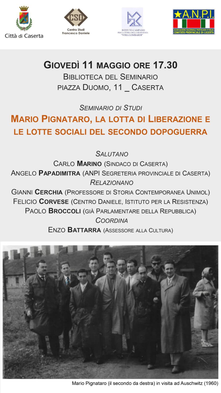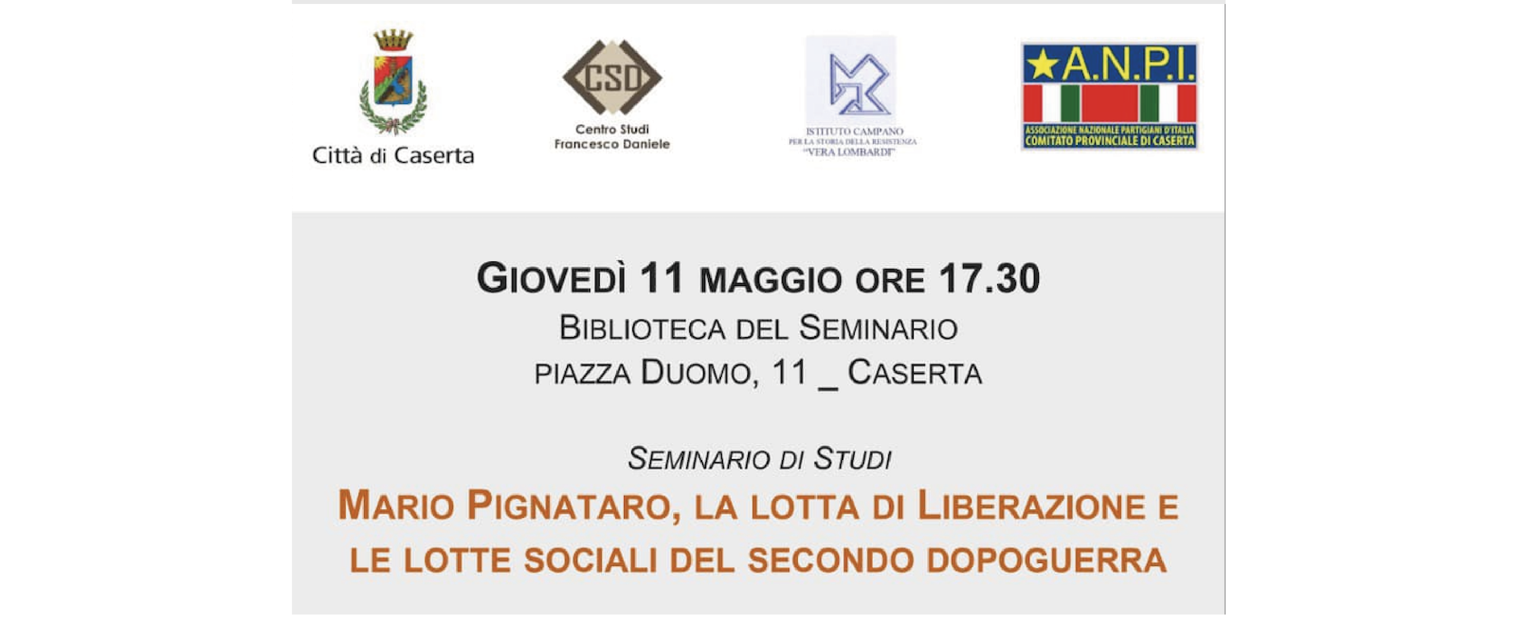 Il Sindaco Carlo Marino porterà i saluti al Seminario di studi dal titolo “Mario Pignataro, la lotta di Liberazione e le lotte sociali del secondo dopoguerra”, in programma giovedì 11 maggio alle ore 17.30 presso la Biblioteca Diocesana in piazza Duomo a Caserta.