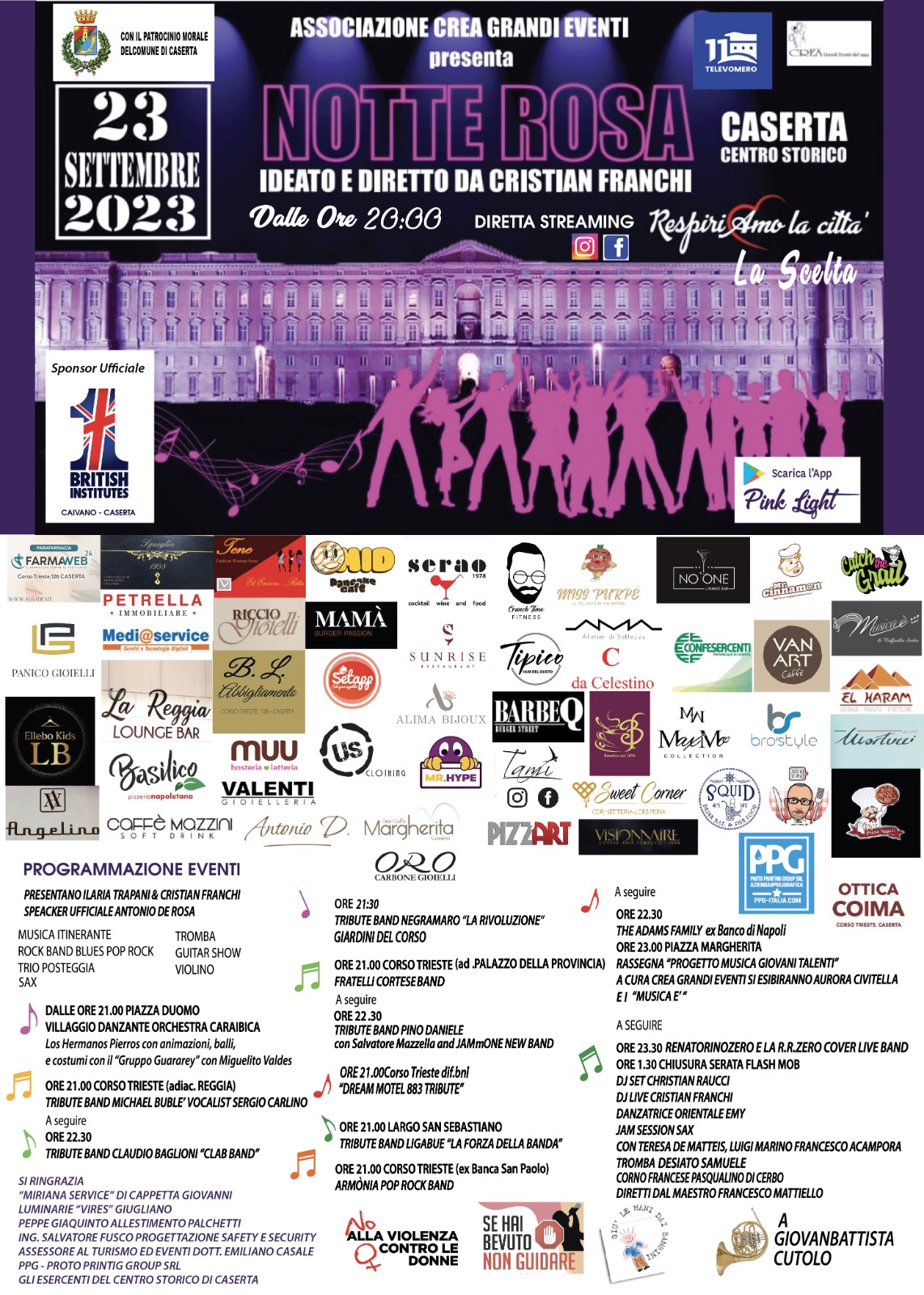 Alla conferenza stampa erano presenti il Vicesindaco e Assessore agli Eventi, Emiliano Casale, e l’ideatore e direttore dell’evento, Cristian Franchi. La “Notte Rosa” prevede spettacoli musicali a partire dalle ore 20 che interesseranno alcuni tra i luoghi più significativi del centro storico quali Corso Trieste, Piazza Dante, Piazza Gramsci e piazza Duomo. L’iniziativa è patrocinata dal Comune di Caserta, è stata organizzata dall’Associazione “Crea Grandi Eventi” con la partecipazione di numerosi esercizi commerciali del centro, che rimarranno aperti fino a tarda sera.