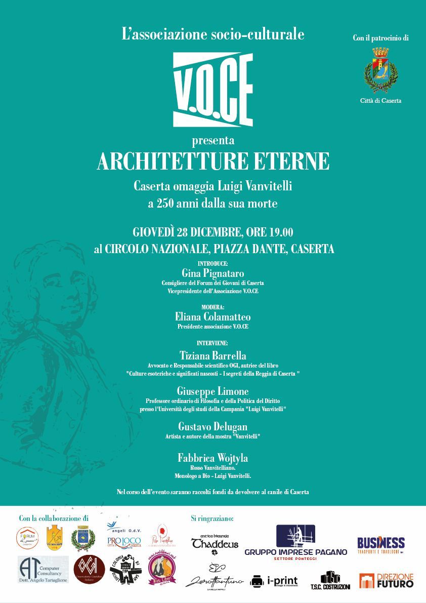 Stasera alle ore 19, presso il Circolo Nazionale in Piazza Dante, č in programma l’incontro “Architetture eterne”, patrocinato dal Comune di Caserta e promosso dalla neonata Associazione socio-culturale V.O.CE. L’evento, che rappresenta un omaggio a Luigi Vanvitelli in occasione del 250esimo anniversario della sua morte, partirā con l’introduzione da parte della Consigliera del Forum dei Giovani di Caserta e Vicepresidente dell’Associazione V.O.CE, Gina Pignataro. I lavori, moderati dalla Presidente dell’Associazione V.O.CE, Eliana Colamatteo, proseguiranno con gli interventi dell’avvocata Tiziana Barrella, del Docente universitario Giuseppe Limone e dell’artista Gustavo Delugan. Previsto anche il monologo “Rosso Vanvitelliano. Monologo a Dio – Luigi Vanvitelli”, proposto dai giovani attori di “Fabbrica Wojtyla”. Nel corso dell’evento saranno raccolti fondi da devolvere al Canile di Caserta.