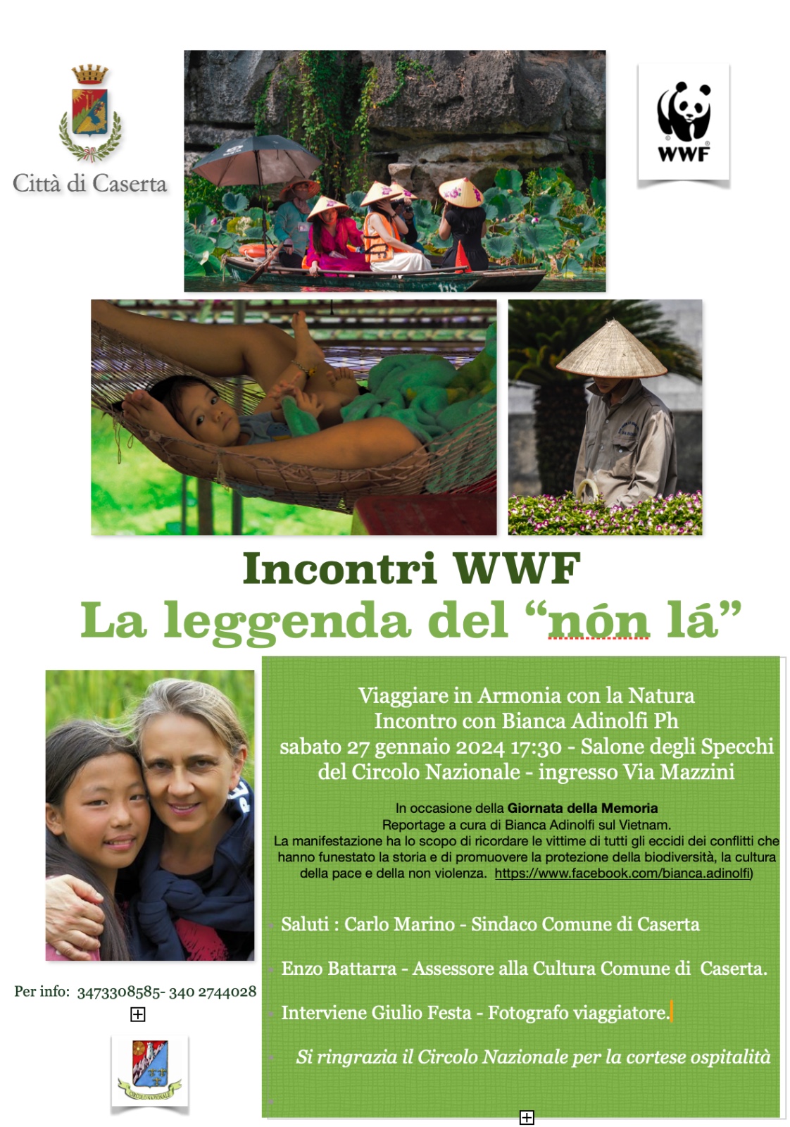 In occasione del “Giorno della Memoria”, sabato 27 gennaio alle ore 17,30, presso il Salone degli Specchi del Circolo Nazionale (ingresso Via Mazzini), č in programma un incontro organizzato dal Wwf, con il patrocinio del Comune di Caserta, dal titolo “La leggenda del non lā”, nel corso del quale verrā presentato il reportage fotografico realizzato in Vietnam dalla fotografa viaggiatrice Bianca Adinolfi. La manifestazione ha lo scopo di ricordare le vittime di tutti gli eccidi dei conflitti che hanno funestato la storia e di promuovere la protezione della biodiversitā, la cultura della pace e della non violenza. All’incontro interverranno il Sindaco di Caserta, Carlo Marino, l’Assessore alla Cultura, Enzo Battarra, e il fotografo viaggiatore, Giulio Festa.