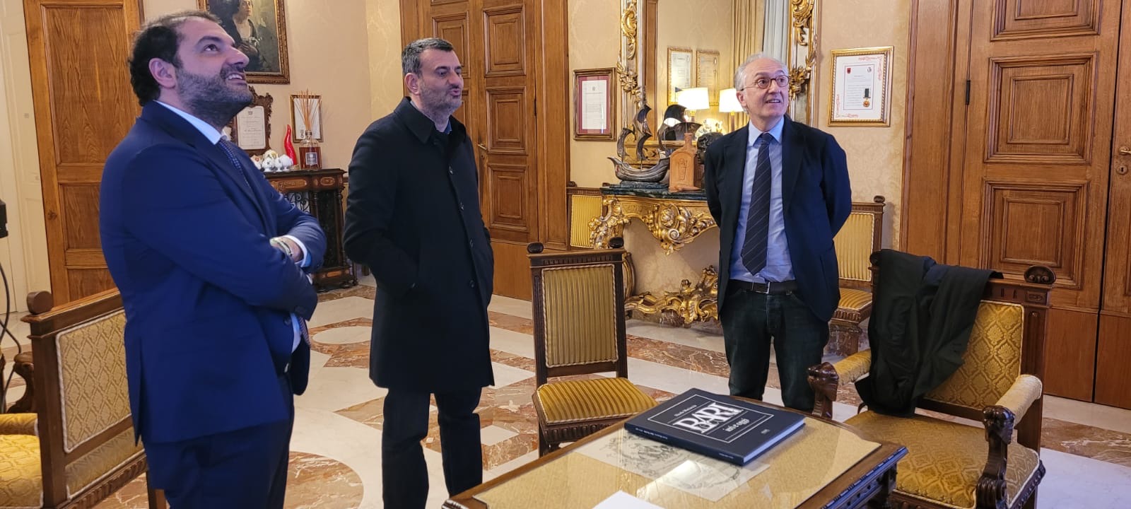 Oggi il Sindaco Carlo Marino ha fatto visita al collega Sindaco di Bari, Antonio Decaro. Marino e Decaro hanno sottolineato il rapporto molto forte che lega le due cittā, luoghi di grande importanza per i Borbone e per il Regno delle Due Sicilie. La stanza del Sindaco Decaro, la Sala Giunta e la Sala Consiliare del Comune di Bari sono arredate con le magnifiche sete di San Leucio, e nello studio del primo cittadino č presente una riproduzione di un quadro che raffigura Gioacchino Murat e che si trova nella Reggia di Caserta. Caserta e Bari: un legame forte, che si rinnova quotidianamente e che prelude a nuove iniziative condivise.
