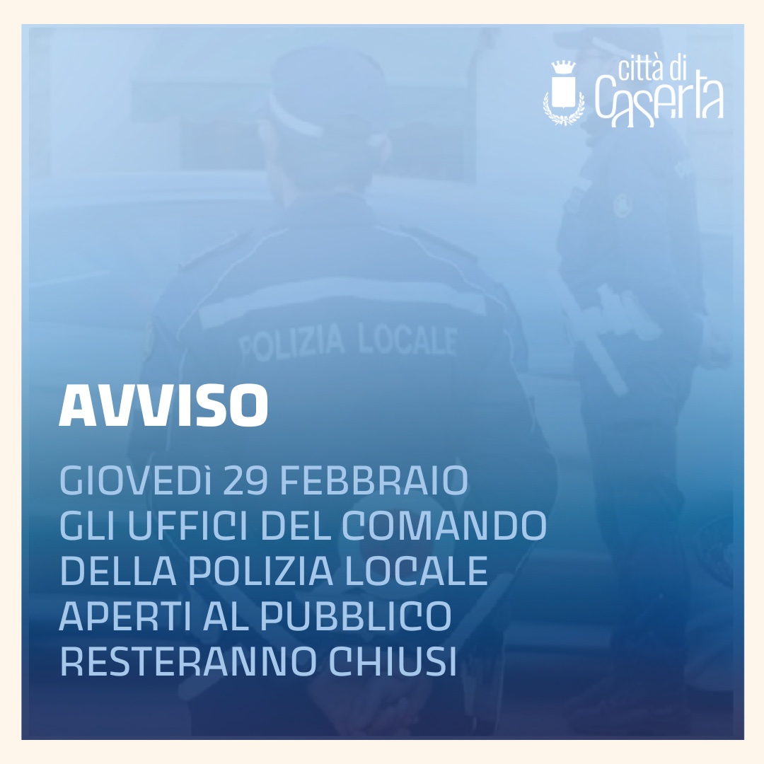 DOMANI, GIOVEDÌ 29 FEBBRAIO, GLI UFFICI DEL COMANDO DELLA POLIZIA LOCALE APERTI AL PUBBLICO RESTERANNO CHIUSI