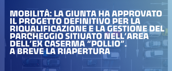 La Giunta Comunale ha approvato il progetto definitivo relativo alla riqualificazione e alla gestione del parcheggio situato nell’area dell’ex Caserma “Pollio”. Tale progetto prevede la presenza di 130 posti destinati alla sosta delle auto, oltre alla realizzazione di un “Tourist Center”, con attività dedicate all’accoglienza turistica. A breve verrà approvato dal Dirigente il progetto esecutivo.