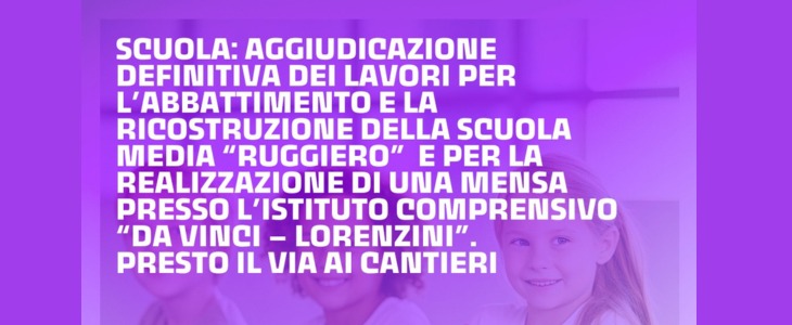 Altro intervento di primaria importanza, per il quale c’è stata un’aggiudicazione definitiva dei lavori, è quello relativo alla realizzazione di una mensa all’interno dell’Istituto comprensivo “Da Vinci – Lorenzini” di via G.M. Bosco. L’intervento, realizzato con risorse Pnrr (Programma “Futura – La scuola per l’Italia di domani”), si avvale di un investimento di 824mila euro.