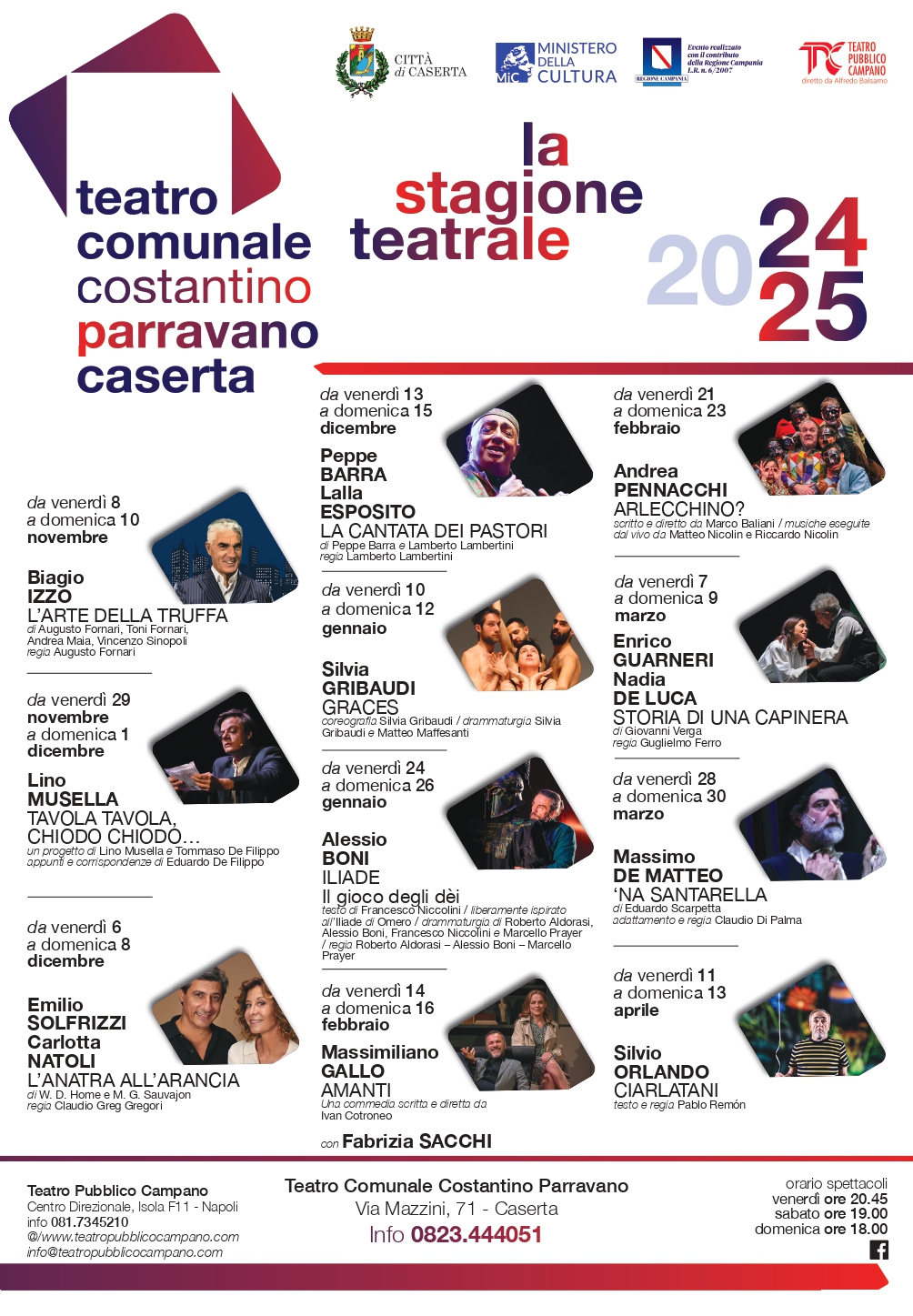 Ricco e variegato il cartellone, con spettacoli di ottimo livello e protagonisti di assoluto valore. Saranno a Caserta, fra gli altri, attori del calibro di Silvio Orlando, Massimiliano Gallo, Alessio Boni, Emilio Solfrizzi, Peppe Barra e Biagio Izzo. Quest’anno spazio anche a un innovativo spettacolo tra danza, teatro e circo dal titolo “Graces”, ispirato alle tre Grazie di Antonio Canova e che porta la firma di Silvia Gribaudi. Un programma di qualità, che conferma come il Teatro Comunale “Parravano” sia diventato un importante punto di riferimento per la cultura a livello regionale e nazionale.