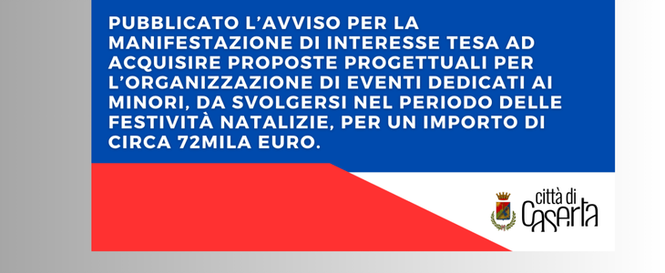 È stato pubblicato sul sito web del Comune di Caserta l’avviso per una manifestazione di interesse tesa ad acquisire proposte progettuali per l’organizzazione di eventi dedicati ai minori, da svolgersi nel periodo delle festività natalizie. Questi eventi saranno realizzati grazie a risorse messe a disposizione dal Dipartimento per le Politiche della Famiglia della Presidenza del Consiglio dei Ministri in favore dei Comuni, per lo svolgimento di attività socio-educative per i minori. Il Comune di Caserta mette a disposizione circa 72mila euro. Le attività dovranno essere effettuate entro il 31 dicembre prossimo. Le proposte dovranno pervenire entro le ore 12 di lunedì 25 novembre.