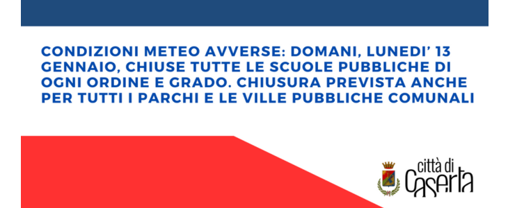 Alla luce delle condizioni meteo avverse che stanno interessando la città di Caserta, e che si protrarranno anche nella giornata di domani, con la presenza di forti venti, con raffiche di particolare intensità, come indicato dal Bollettino emesso dalla Protezione Civile regionale, il Sindaco Carlo Marino ha firmato un’ordinanza con la quale si stabilisce la chiusura, per domani lunedì 13 gennaio, di tutte le attività scolastiche e didattiche delle scuole cittadine pubbliche di ogni ordine e grado, inclusi gli asili nido comunali. Restano escluse dalla sospensione le scuole non statali, gli istituti privati e le Università. Ai responsabili delle scuole non statali, degli istituti privati e delle Università si richiede di effettuare con urgenza tutte le necessarie verifiche volte a garantire la sicurezza delle strutture scolastiche di rispettiva pertinenza e la tutela della pubblica e privata incolumità. L’apertura è consentita esclusivamente previa verifica dell’assenza di situazioni di pericolo o danno per gli studenti e per la cittadinanza.