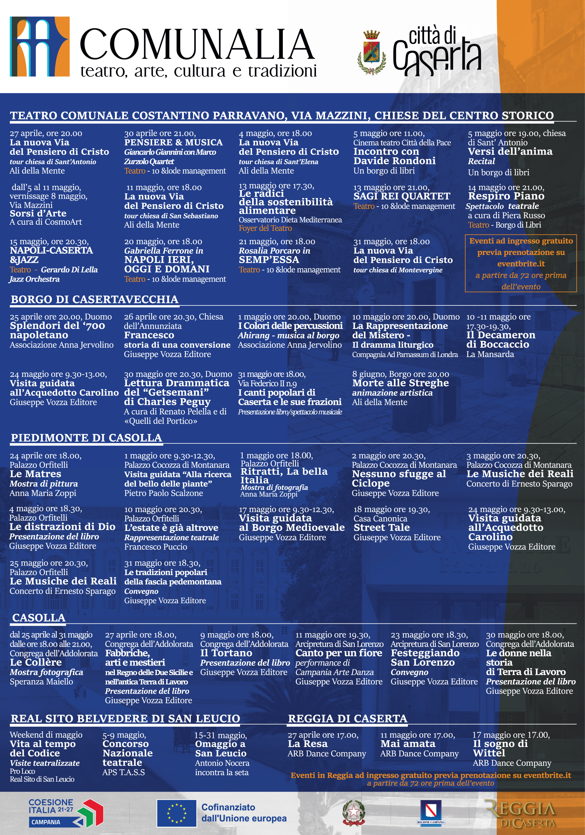“Comunalia – ha spiegato il Sindaco di Caserta, Carlo Marino – apre la stagione degli eventi della città di Caserta, che proseguirà in estate con le grandi iniziative di ‘Un’estate da Re’ all’interno della Reggia e quelle di ‘Un’estate da BelvedeRe’, sia davanti al Palazzo Reale che al Belvedere di San Leucio. Inoltre, riproporremo ‘Settembre al Borgo’ e ‘Un Borgo di Libri’ e chiuderemo l’anno con gli eventi natalizi. Con Comunalia abbiamo voluto effettuare una contaminazione tra i vari luoghi della nostra città, mescolando le tradizioni e le peculiarità di ogni quartiere e di ogni borgata. L’obiettivo è quello di mettere insieme le energie di un’intera città, rafforzando l’identità e il senso di comunità, anche attraverso iniziative artistico-culturali inclusive, capaci di attrarre in città un gran numero di visitatori. Il cartellone è di ottimo livello, con la presenza di nomi di primo piano e manifestazioni di qualità. Siamo convinti che queste iniziative rappresenteranno una formidabile opportunità per far conoscere all’esterno la bellezza di tanti luoghi della nostra città che sono meno noti”.